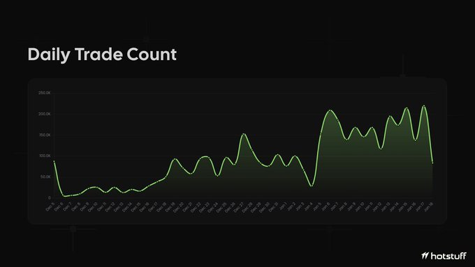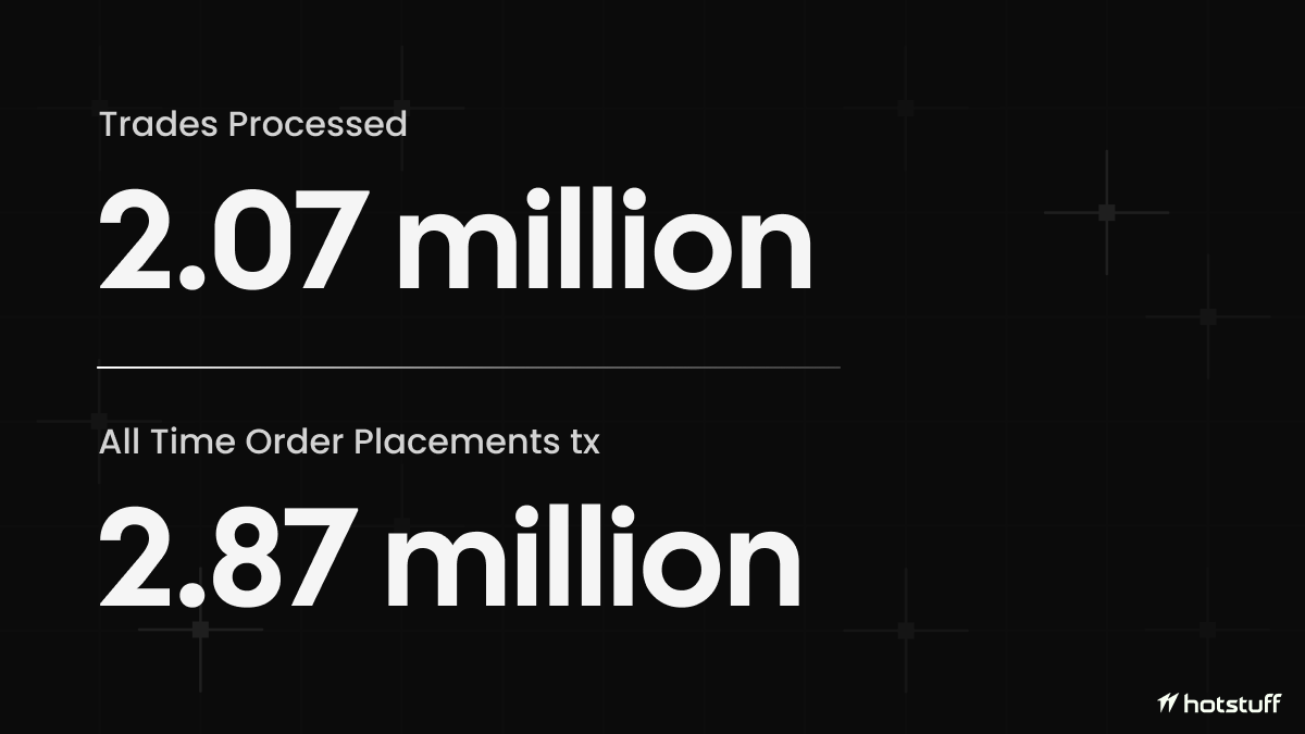 The chart tells the story: organic growth in early December, then exponential scaling as automated systems discovered the API. Peak days saw 200k+ trades processed. The validator nodes handled it all without consensus failures.
